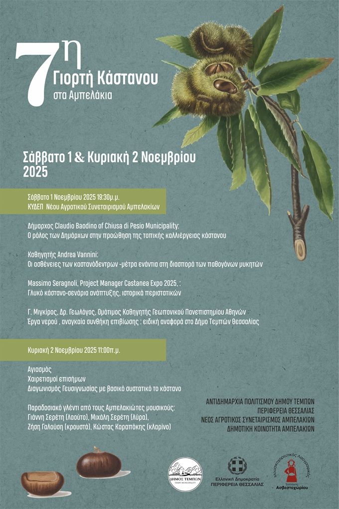 Τo Σάββατο 1 Νοεμβρίου και ώρα 19:30, στο Κτίριο του Νέου Αγροτικού Συνεταιρισμού Αμπελακίων, η εκδήλωση ξεκινά με τις ομιλίες και εισηγήσεις των: Claudio Baodino, Δήμαρχου του Δήμου Chiusa di Pesio: “ο ρόλος των Δημάρχων στην προώθηση της τοπικής καλλιέργειας του κάστανου” , Andrea Vannini: “μέτρα ενάντια στη διασπορά των παθογόνων μυκητών”, Massimo Seragnoli, υπεύθυνος έργου Έκθεσης Κάστανου 2025: “γλυκό κάστανο-σενάρια ανάπτυξης, ιστορικά περιστατικών”, Γ. Μιγκίρος, Δρ. Γεωλόγος, Ομότιμος Καθηγητής Γεωπονικού Πανεπιστημίου Αθηνών: “έργα νερού-αναγκαία συνθήκη επιβίωσης: ειδική αναφορά στο Δήμο Τεμπών”.